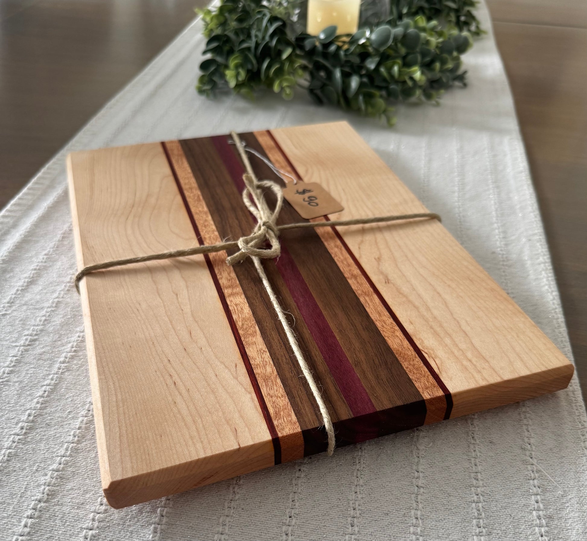 Maple /w Black Walnut and Purple Heart, African Padauk and Okoume wood cutting board